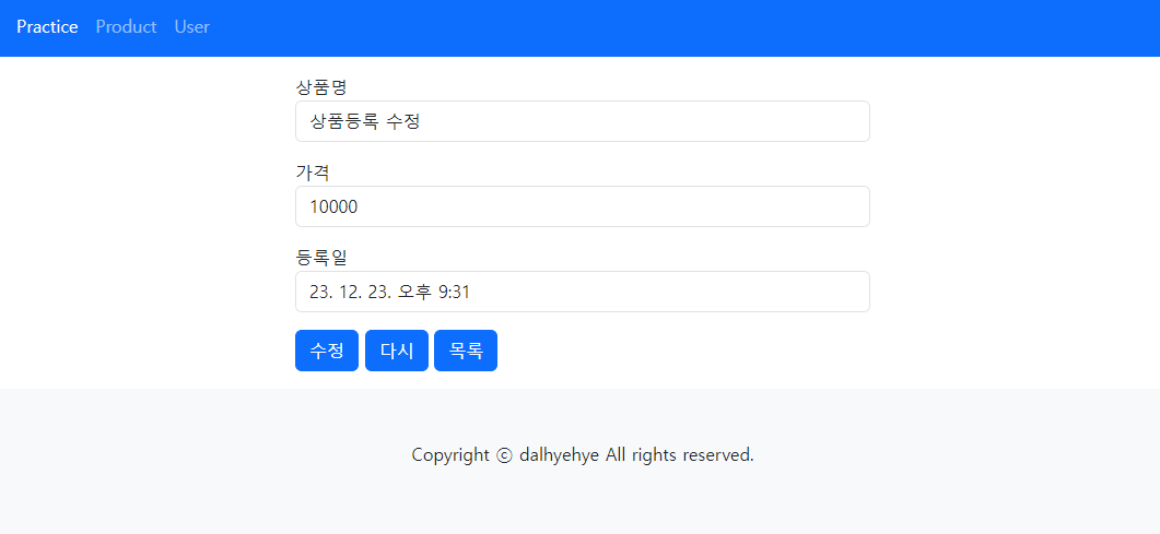 사용자가 입력한 값들이 자동으로 productDTO 객체에 반영되고, 이 객체의 값을 폼 필드에 초기값으로 설정